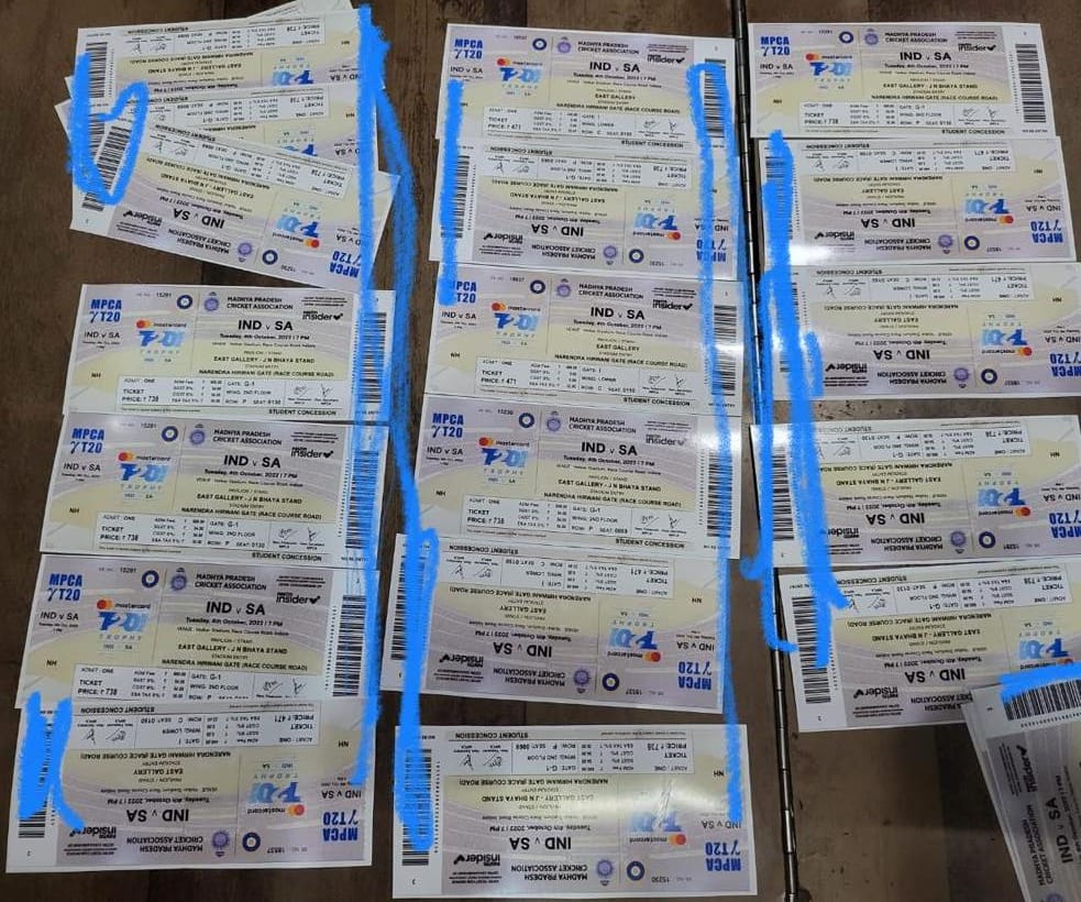 मामला इंदौर के विजय नगर थाना क्षेत्र का है पुलिस को मुखबिर से मिली सूचना के बाद पुलिस ने ग्राहक बनकर एक ऐसे गिरोह का पर्दाफाश किया है जहां खुलकर स्टेडियम में होने वाले भारत और साउथ अफ्रीका मैच की टिकटों की कालाबाजारी कर रहे थे। पकड़े गए आरोपी पुनीत तेजवानी और प्रणय मालपानी से 7 ओरिजिनल और 30 से भी अधिक डुप्लीकेट फर्जी टिकट बरामद किए हैं। आरोपी मैच के टिकटों को 4 से 5 गुना अधिक भाव में बेच रहे थे।