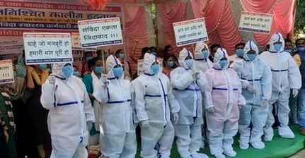प्रदेश के बुरहानपुर जिले में संविदा स्वास्थ्य कर्मचारियों ने पीपीई कीट पहनकर विरोध जताया,अपनी मांगों को लेकर विरोध जता रहे कर्मचारी लगातार हड़ताल पर बैठे हैं।