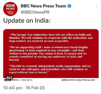 बीबीसी ने बयान में कहा कि हम हमारे कर्मचारियों के साथ खड़े हैं, जिनमें से कुछ के साथ घंटों तक पूछताछ की गई और कुछ को पूछताछ के लिए रातभर ऑफिस में रुकना पड़ा। उनकी देखरेख हमारी प्राथमिकता है। हमारा कामकाज अब सामान्य हो गया है और हम भारत और इससे इतर हमारे दर्शकों और पाठकों के लिए एक्टिव बने रहेंगे।