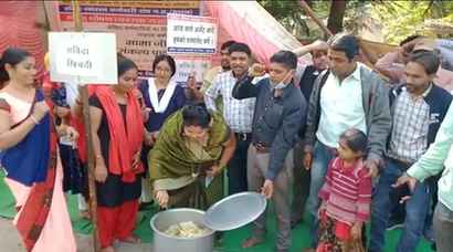 मप्र में संविदा स्वास्थ्य कर्मचारी करीब 2 हफ्ते से हड़ताल पर है और पूरे मप्र में विभिन्न जिलों व ब्लॉक पर संविदा स्वास्थ्यकर्मी धरना देकर विरोध प्रदर्शन कर रहे हैं। इसी कड़ी में बुरहानपुर जिले के संविदा कर्मचारियों ने अनूठा विरोध प्रदर्शन किया। आधे वेतन में केवल खिचड़ी ही बन सकती, इसलिये कर्मचारियों ने चूल्हे पर संविदा खिचड़ी बनाकर खिचड़ी खाकर विरोध जताया।