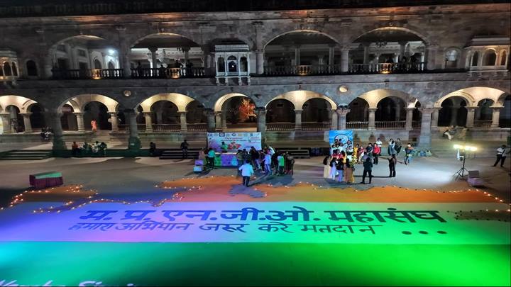 इसी के तहत आगामी चुनाव को लेकर मध्यप्रदेश एनजीओ महासंघ द्वारा जिला प्रशासन इंदौर के साथ मिल कर मतदान हेतु जनजागृति अभियान चलाया जा रहा है। इसी कड़ी में रविवार को राजबाड़ा में एक अद्भुत अभियान आयोजित किया गया। जिसमे चार हजार वर्ग फिट की रांगोली के माध्यम से मध्यप्रदेश का नक्शा बनाया गया। जिसे 5 हजार दीपो से ब्लाइंड बच्चों और अन्य एनजीओ के कार्यकर्ताओं द्वारा सजाया गया।