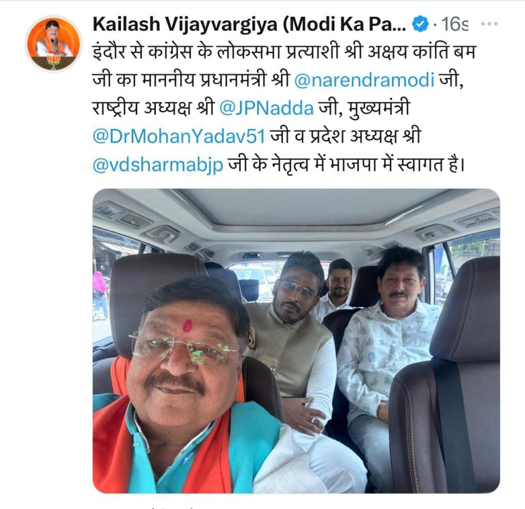 भाजपा के वरिष्ठ नेता और मध्य प्रदेश के मंत्री कैलाश विजयवर्गीय ने अक्षय के साथ एक सेल्फी सोशल मीडिया पर पोस्ट करते हुए उनका भाजपा में स्वागत किया। विजयवर्गीय ने लिखा, ‘इंदौर से कांग्रेस के लोकसभा प्रत्याशी अक्षय कांति बम जी का माननीय प्रधानमंत्री नरेंद्र मोदी जी, राष्ट्रीय अध्यक्ष जेपी नड्डा जी, मुख्यमंत्री मोहन यादव जी और प्रदेश अध्यक्ष वीडी शर्मा जी के नेतृत्व में भाजपा में स्वागत है।’ इस सेल्फी में कैलाश विजयवर्गीय, रमेश मेंदोला और अक्षय बम एक वाहन में एक साथ सवार दिख रहे हैं।