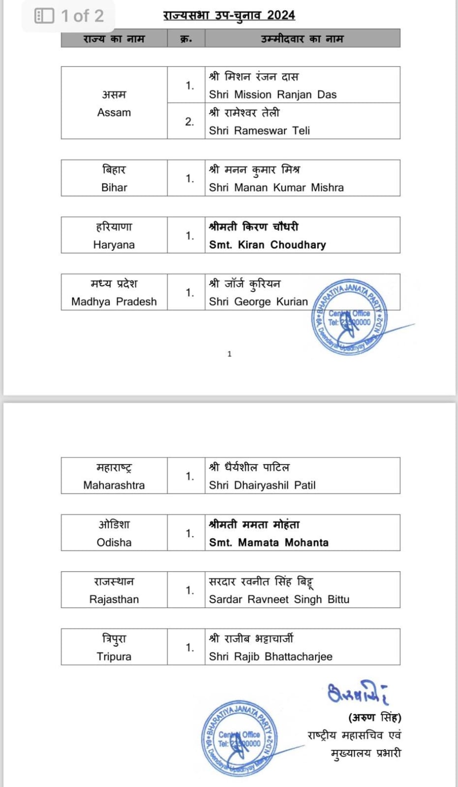 असम से मिशन रंजन दास और रामेश्वर तेली, बिहार से मनन कुमार मिश्रा, हरियाणा से किरण चौधरी, मध्य प्रदेश से जॉर्ज कुरियन, महाराष्ट्र से धैर्यशील पाटिल, ओडिशा से ममता मोहंता, राजस्थान से सरदार रवनीत सिंह बिट्टू और त्रिपुरा से राजीव भट्टाचार्जी को उम्मीदवार बनाया है। यहां बता दें कि रवनीत सिंह बिट्टू पंजाब से लोकसभा चुनाव लड़े थे लेकिन हार गए इसके बाद पार्टी ने उन्हें राज्यसभा के लिए उम्मीदवार बनाया है। केंद्र में तीसरी बार मोदी सरकार बनने के बाद जब शपथ ग्रहण हुआ तो बिट्टू ने मंत्री पद की शपथ ली थी।