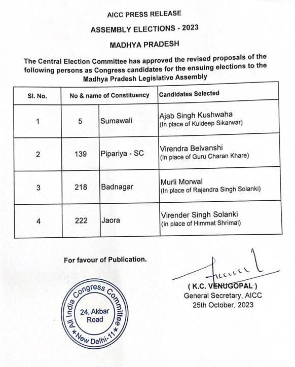 कांग्रेस ने मुरैना जिले के सुमावली में कुलदीप सिकरवार की जगह अजब सिंह कुशवाहा, नर्मदापुरम के पिपरिया में गुरुचरण खरे की जगह वीरेंद्र बेलवंशी, उज्जैन के बड़नगर में राजेंद्र सिंह सोलंकी की जगह मुरली मोरवाल और रतलाम के जावरा में हिम्मत श्रीमाल की जगह वीरेंद्र सिंह सोलंकी को प्रत्याशी बनाया है।