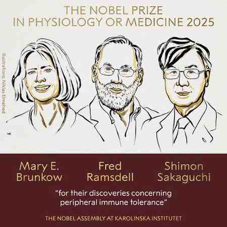 वर्ष 2025 के चिकित्सा क्षेत्र के नोबेल पुरस्कार की घोषणा कर दी गई है। रॉयल स्वीडिश एकेडमी ऑफ साइंसेज ने सोमवार को फिजियोलॉजी या मेडिसिन के नोबेल पुरस्कार विजेताओं को नाम का ऐलान किया है। इस साल तीन वैज्ञानिकों- मैरी ई. ब्रुनको, फ्रेड रामस्डेल और शिमोन सकागुची को चिकित्सा क्षेत्र का नेबोल पुरस्कार मिला है। परिधीय प्रतिरक्षा सहिष्णुता (पेरिफेरल इम्यून टॉलरेंस) से संबंधित खोजों के लिए तीनों को नोबेल का मिला है।