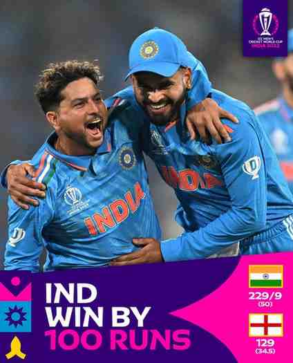 आईसीसी वनडे क्रिकेट वर्ल्डकप में आज भारत और इंग्लैंड के बीच मुकाबला खेला गया। भारत ने वर्ल्डकप में अपना विजय रथ अभियान जारी रखा और अपने छटे मैच में इंग्लैंड को 100 रनों से हराकर मैच अपने नाम किया। भारतीय टीम ने इस वर्ल्डकप में लगातार छटी जीत हासिल की हैं। भारत ने इंग्लैंड को 129 रनों पर ही ऑल आउट कर दिया।