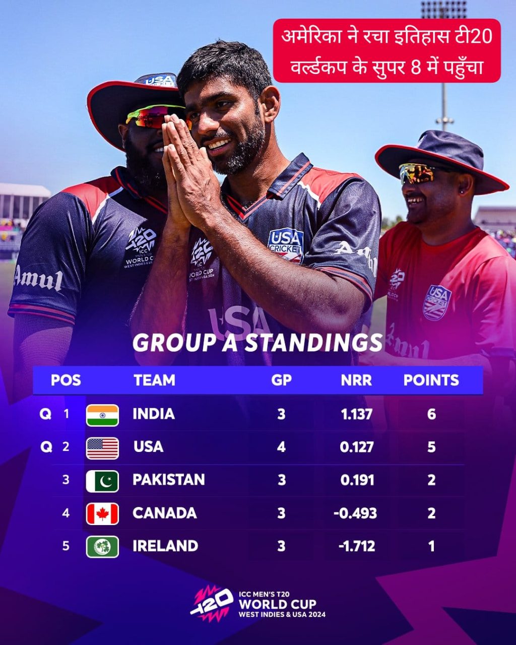 फ्लोरिडा में बारिश के चलते आयरलैंड और अमेरिका का मैच नहीं हो पाया और अमेरिकी टीम को एक अंक और मिला। इसके साथ ही वो सुपर-8 में पहुंच गई। वहीं पाकिस्तान की टीम सुपर-8 की रेस से बाहर हो गई।