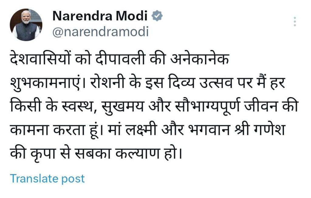 प्रधानमंत्री नरेंद्र मोदी ने देशवासियों को दी दीपो के पर्व दीपावली की शुभकामनाएं, एक्स पर यह लिखा