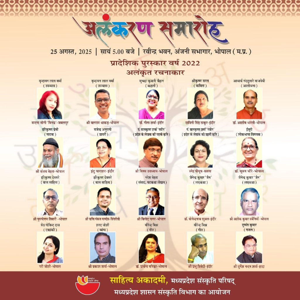 भोपाल: साहित्य अकादमी, मध्यप्रदेश संस्कृति परिषद्, संस्कृति विभाग, मध्यप्रदेश शासन द्वारा आयोजित अलंकरण समारोह आगामी 25 अगस्त, 2025 को सायं 5.00 बजे रवीन्द्र भवन, अंजनी सभागार, भोपाल में संपन्न होगा। इस अवसर पर वर्ष 2022 और 2023 के लिए घोषित अखिल भारतीय पुरस्कार, प्रादेशिक पुरस्कार तथा मध्यप्रदेश की छह बोलियों के साहित्यिक पुरस्कारों से चयनित रचनाकारों को अलंकृत किया जाएगा।