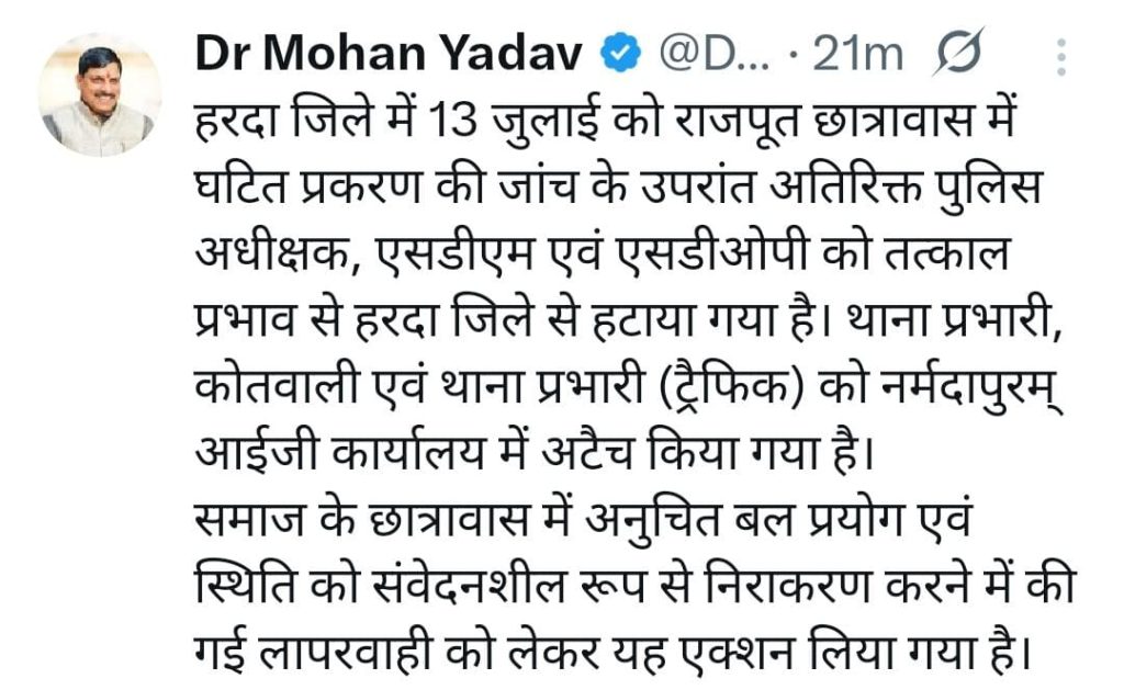 मुख्यमंत्री डॉ. यादव ने कहा कि हरदा कोतवाली के थाना प्रभारी एवं थाना प्रभारी (ट्रैफिक) को भी आईजी कार्यालय, नर्मदापुरम में अटैच कर दिया गया है।