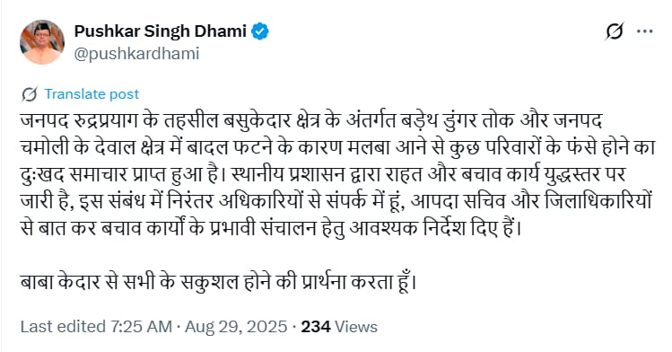 बताया जा रहा है कि आवास के पास मौजूद गौशाला मलबे में दब गई है, जिसमें लगभग 15 से 20 जानवर दबने की सूचना है। प्रदेश के मुख्यमंत्री पुष्कर सिंह धामी ने भी एक्स पर इसकी जानकारी दी। उन्होंने लिखा, जनपद रुद्रप्रयाग के बसुकेदार क्षेत्र के बड़ेथ डुंगर तोक और चमोली जिले के देवाल क्षेत्र में बादल फटने से मलबा आया है। इसकी वजह से कुछ परिवार फंस गए हैं। स्थानीय प्रशासन राहत और बचाव कार्य तेजी से कर रहा है। मैं लगातार अधिकारियों से संपर्क में हूं और आपदा सचिव व जिलाधिकारियों को निर्देश दिए हैं कि बचाव कार्य सही तरीके से और तेजी से किए जाएं।