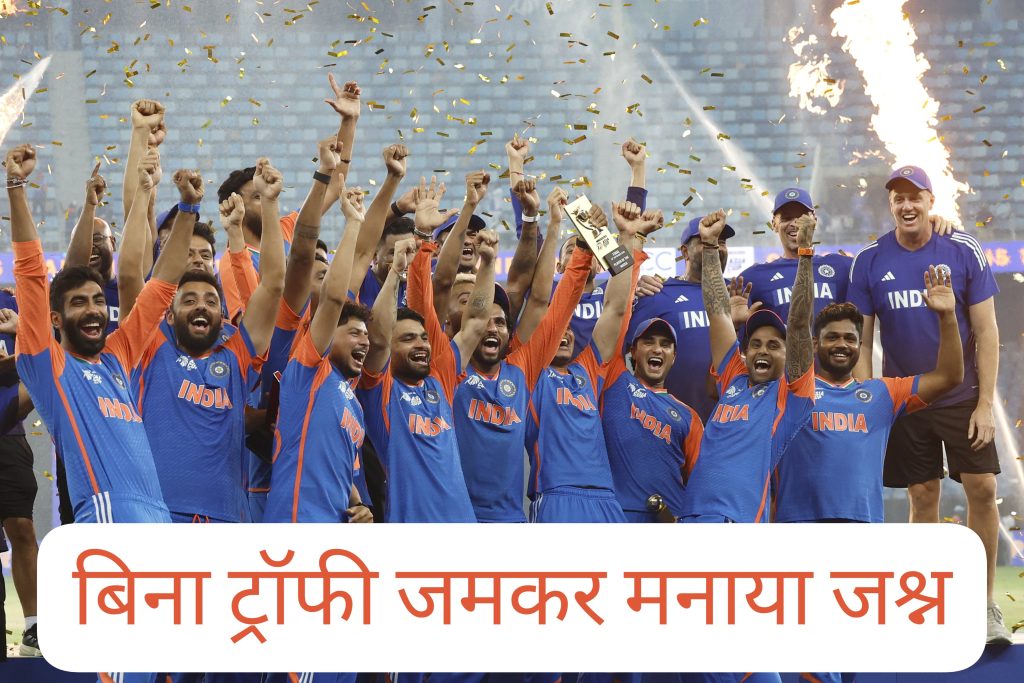 भारतीय खिलाड़ियों ने बिना ट्रॉफी के ही जीत का जश्न मनाया और पोडियम पर खड़े होकर फोटो सेशन करवाया। भारतीय खिलाड़ियों ने जमकर जश्न मनाया।