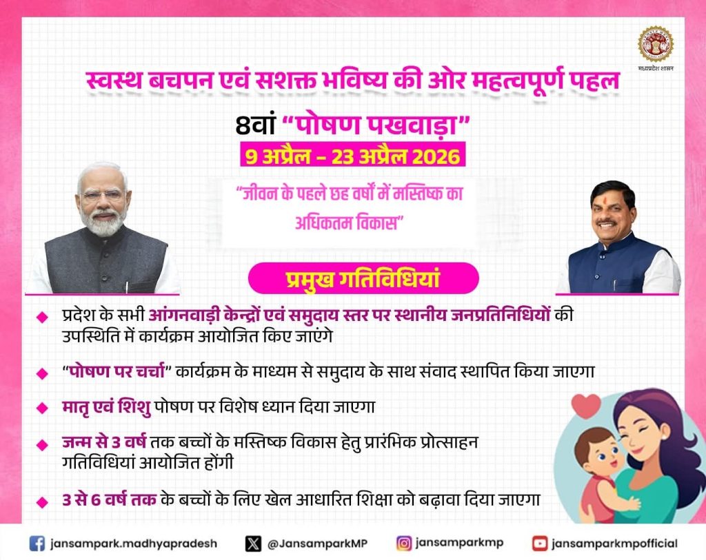 भोपाल: प्रदेश में 9 अप्रैल से 23 अप्रैल 2026 तक 8वां “पोषण पखवाड़ा” मनाया जाएगा। इस वर्ष पोषण पखवाड़े का मुख्य थीम “जीवन के पहले छह वर्षों में मस्तिष्क का अधिकतम विकास (Maximizing Brain Development in the First Six Years of Life)” निर्धारित किया गया है। पखवाड़े का औपचारिक शुभारंभ 9 अप्रैल को आंगनवाड़ी केन्द्रों और समुदाय स्तर पर स्थानीय जनप्रतिनिधियों की उपस्थिति में किया जाएगा। इस दौरान “पोषण पर चर्चा” कार्यक्रम के माध्यम से समुदाय के साथ संवाद स्थापित किया जाएगा।
