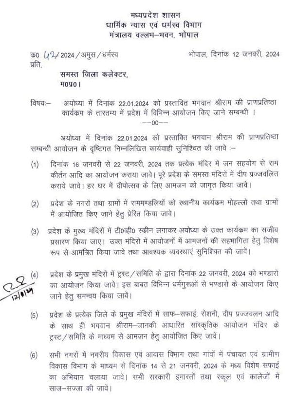 भोपाल: अयोध्या में आगामी 22 जनवरी को प्रस्तावित भगवान श्रीराम की प्रतिमा की प्राण प्रतिष्ठा को दृष्टिगत रखते हुए प्रदेश के सभी जिलों में विभिन्न कार्यक्रम आयोजित करने के निर्देश कलेक्टरों को जारी किये हैं। आदेश में 16 से 22 जनवरी तक के विभिन्न सामाजिक एवं सांस्कृतिक कार्यक्रमों को गरिमापूर्वक मनाने के लिये आवश्यक निर्देश दिये गये हैं।